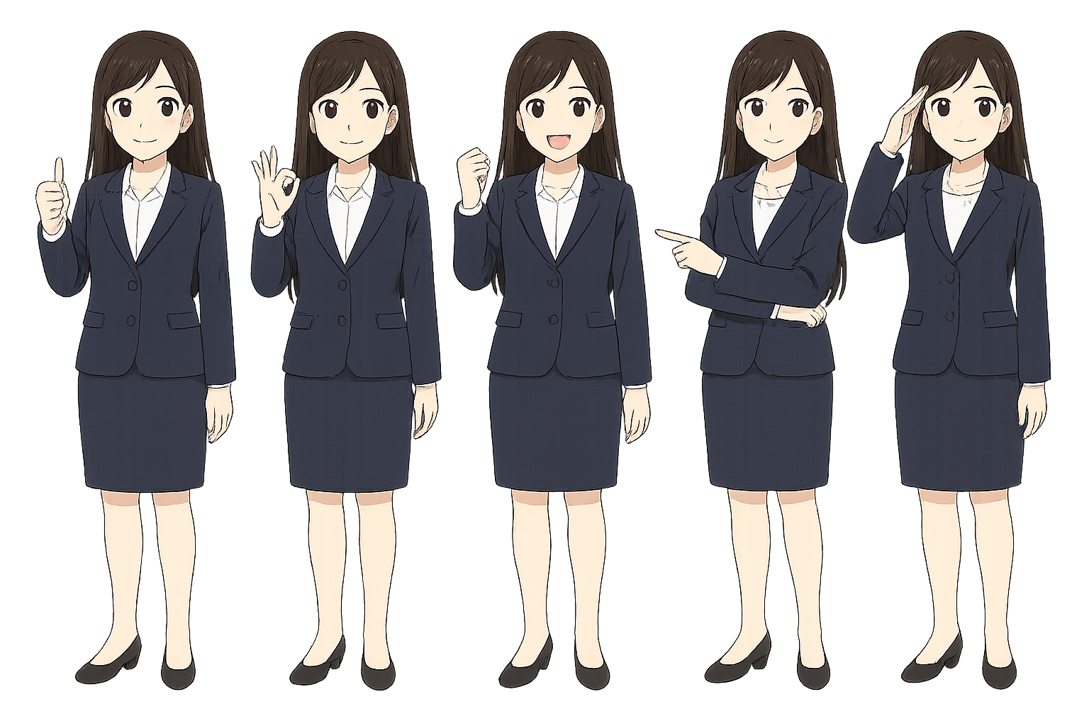 紺のスーツにロングヘアが特徴のビジネスウーマンイラストです。5カット1枚にまとめてありますが、背景を透過処理してありますので切り取ってお好みの画像に配置いただけます。