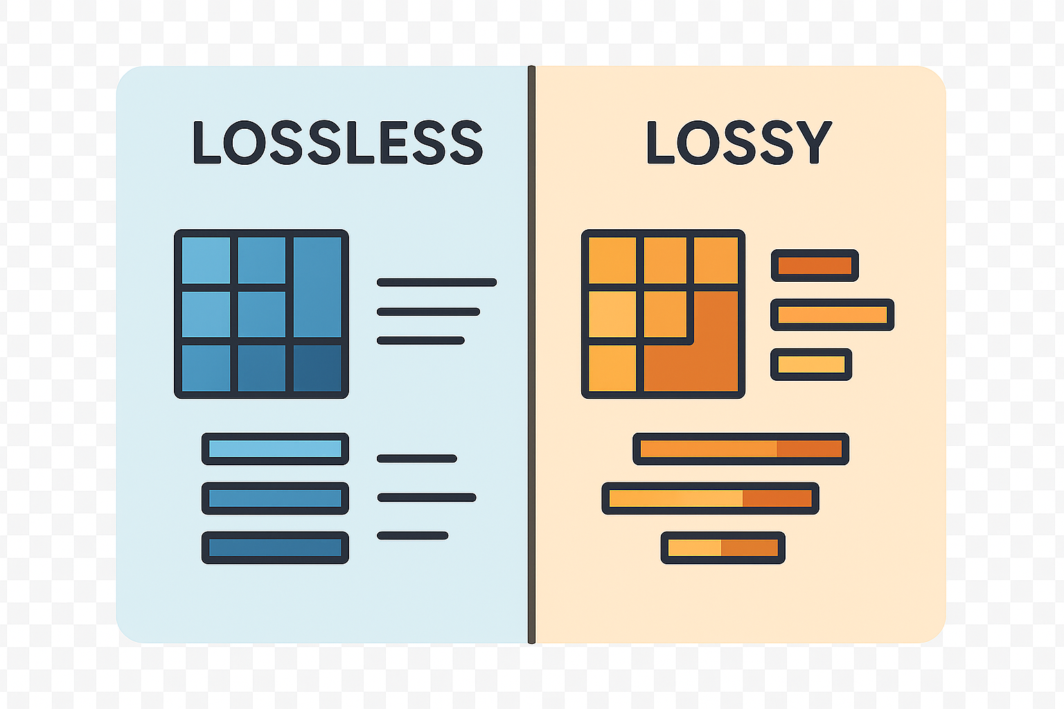 画質を劣化させずにファイルだけ軽くする方式です。PNG や SVG などで使われることが多く、圧縮前とまったく同じ状態に復元できます。