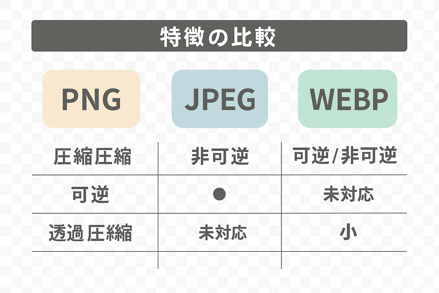 PNG・JPEG・WEBPの違いを、ざっくり整理すると次のようになります。