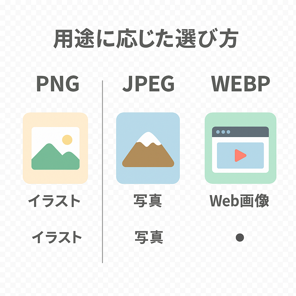 最近は WEBP(ウェッピー) という新しい形式も増えてきて、「どれを選べばいいのか分からない」という声もよく聞きます。